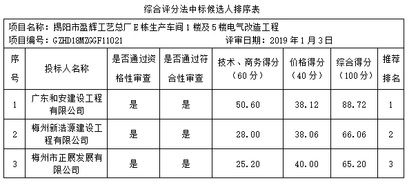 | 廣州宏達工程顧問集團有限公司(以下簡稱“招標代理機構”)受揭陽市盈輝工藝總廠(以下簡稱“招標人”)的委托,于2019年1月3日就揭陽市盈輝工藝總廠E棟生產車間1樓及5樓電氣改造工程(項目編號GZHD18MZGGF11021)采用公開招標方式進行采購?,F就本次招標的中標結果公告如下: 一、招標人名稱:揭陽市盈輝工藝總廠 二、項目名稱:揭陽市盈輝工藝總廠E棟生產車間1樓及5樓電氣改造工程 三、項目編號:GZHD18MZGGF11021 四、招標方式:公開招標 五、招標項目簡要說明:(包括內容、簡要技術要求、合同履行日期等) 1、項目內容:揭陽市盈輝工藝總廠E棟生產車間1樓及5樓電氣改造工程; 2、簡要技術要求、合同履行日期:詳見招標文件用戶需求。 六、招標公告日期及媒體:招標代理機構于2018年12月10日在公開的媒體廣州宏達工程顧問集團有限公司(http://www.wangtat.com.cn/)、中國采購與招標網(http://www.chinabidding.com.cn/)上發布了招標公告。 七、評審信息: 1、評審日期:2019年1月3日 2、評審地點:梅州市梅江區客都大道東匯城寫字樓D2棟10樓1006號(廣州宏達工程顧問集團有限公司梅州分公司) 3、評標委員會負責人:潘廷 4、評標委員會其他成員:蔡堅、陳志年、朱志勇、鐘輝 八、評審結果詳情如下: ![]() 九、中標信息: 1、中標人名稱:廣東和安建設工程有限公司 2、法人代表:管劍開 3、中標人地址:梅州市梅縣區程江鎮憲梓大道(和安大廈) 4、中標金額(人民幣):伍拾玖萬玖仟捌佰捌拾元零捌分(¥599,880.08) 十、本公告期限1個工作日。 十一、聯系事項: 1、招標人聯系方式 招標人名稱:揭陽市盈輝工藝總廠 招標人地址:廣東省揭陽市揭東區玉窖鎮 2、招標代理機構名稱:廣州宏達工程顧問集團有限公司 招標代理機構聯系地址:梅州市梅江區客都大道東匯城寫字樓D2棟D2-1006號 項目聯系人:卓先生 招標項目聯系電話:0753-2259923 招標代理機構傳真:0753-2251923 此中標公告即為招標結果通知書。如果投標人對此結果有異議的,可以在中標公告發布之日起七個工作日內以書面形式向我公司提出質疑,質疑函中應明確權益受到損害的事實與理由。逾期將依法不予受理。 特此通知! 廣州宏達工程顧問集團有限公司 2019年1月4日 |